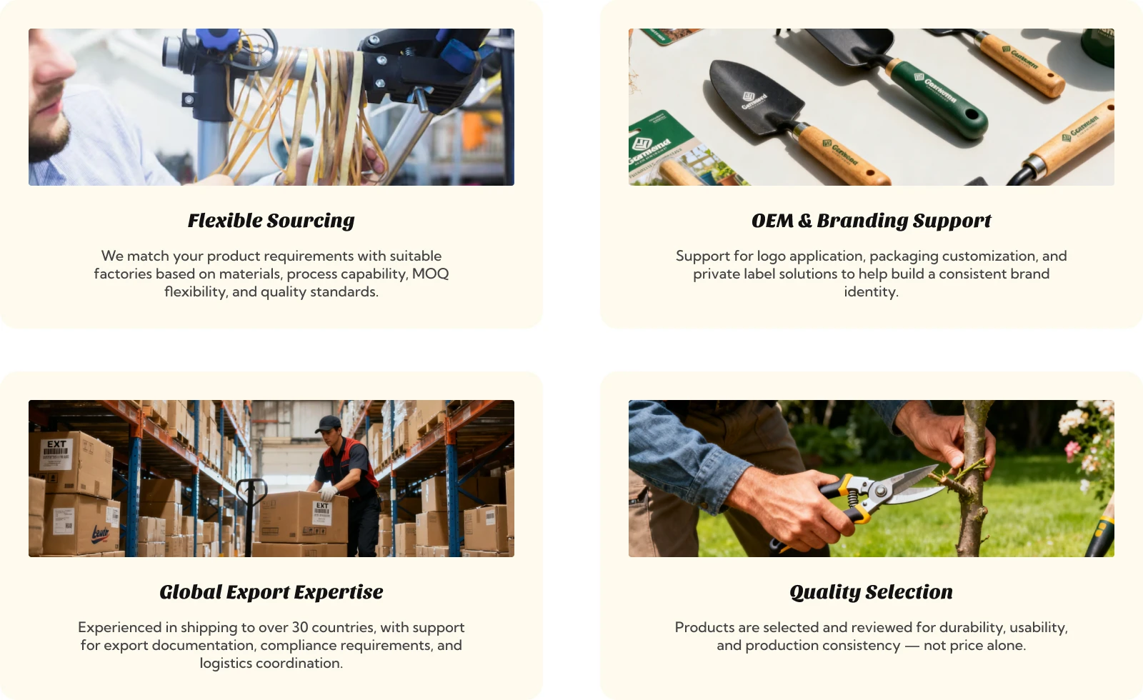 Today, we help professional buyers, wholesalers, and brands source garden tools and accessories with confidence — from product selection and OEM customization to export compliance and logistics coordination.