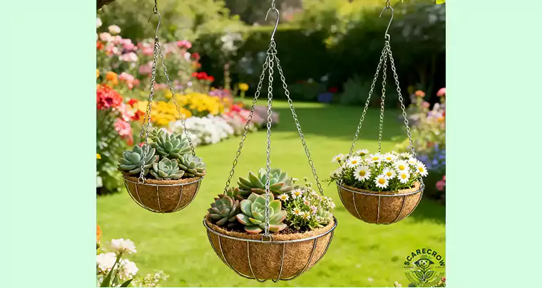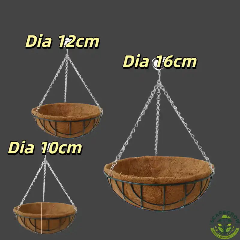 Durable metal hanging planter with natural coco liner, designed for stylish outdoor flower and garden decoration.