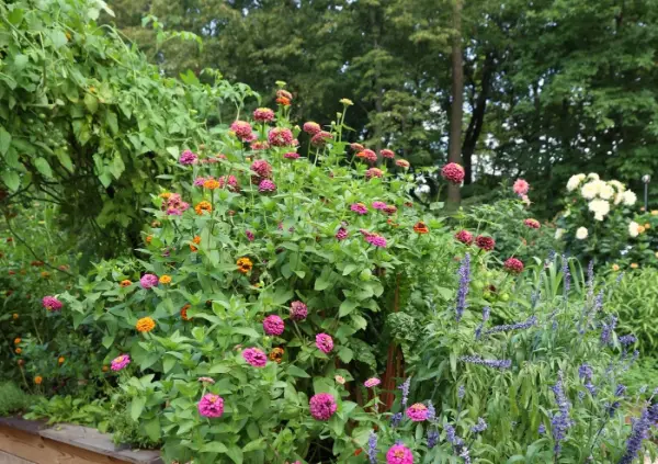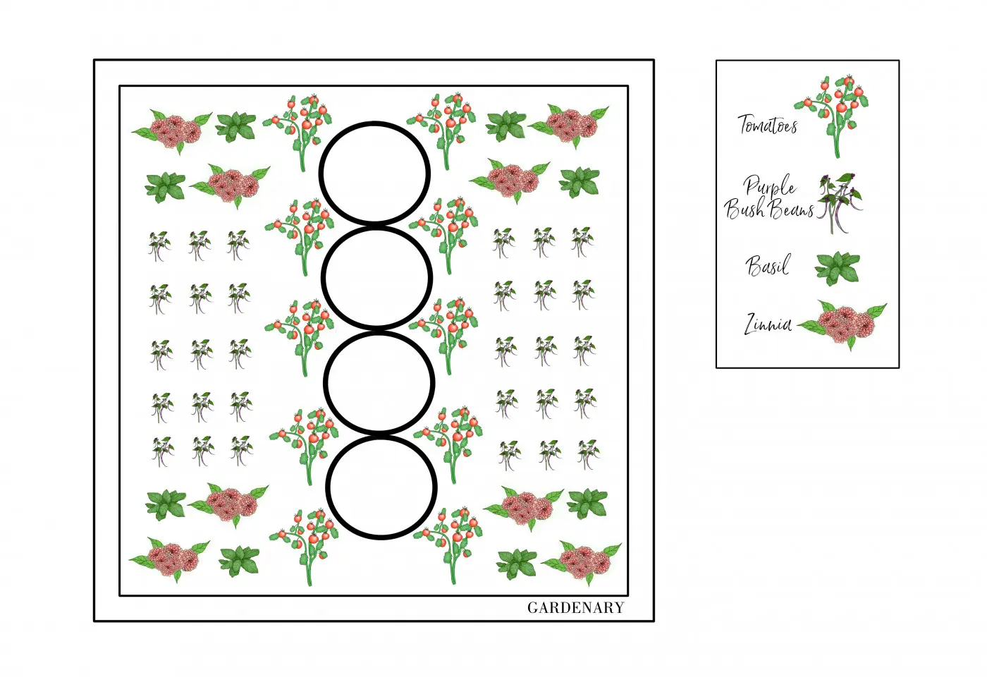 The planting plan below is for a 4' x 4' raised bed in the warm growing season. There are short zinnias and basil plants in every corner for pest protection, beauty, and production. Purple bush beans can be packed in and will produce a ton of beans and keep the soil nice and covered.