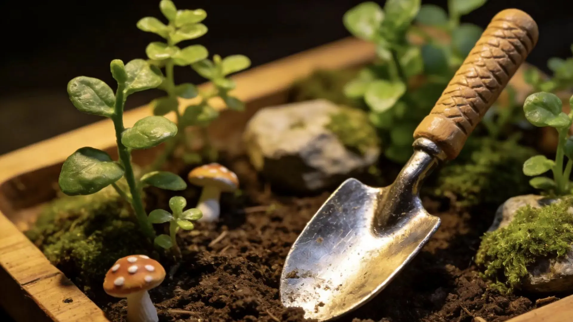 garden trowel in a lush backyard gardening scene.